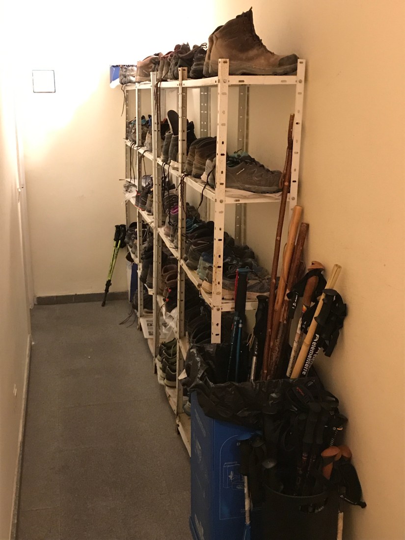 When we finally reach our destination, our next task is to find the albergue we want to stay in. The check in process is always the same. Take your boots off and leave them with your poles outside the entryway. Give the hospitalero your passport and your credencial. At each place you stay, your credencial is stamped. This proves you have actually walked and is needed when you get to Santiago in order to get your Compostela, the official document awarded to bona fide Pilgrims.