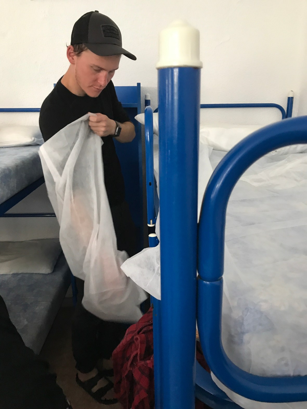 Ryan putting the paper/plastic sheet and pillowcase on the bed.