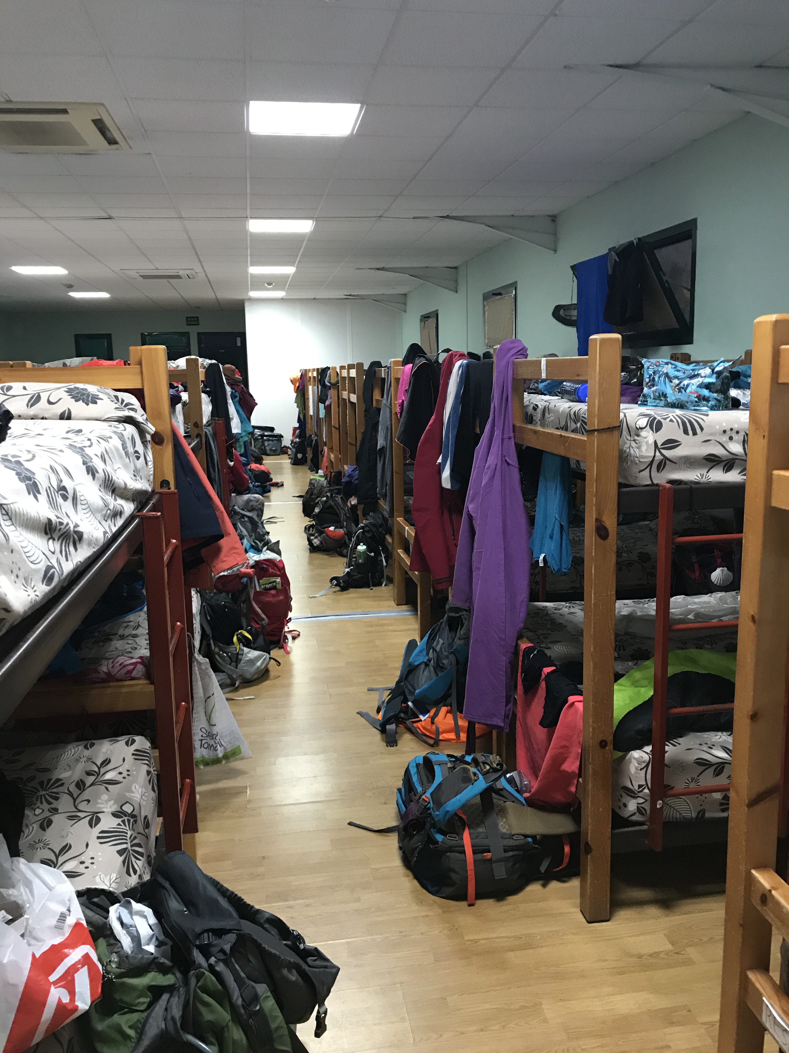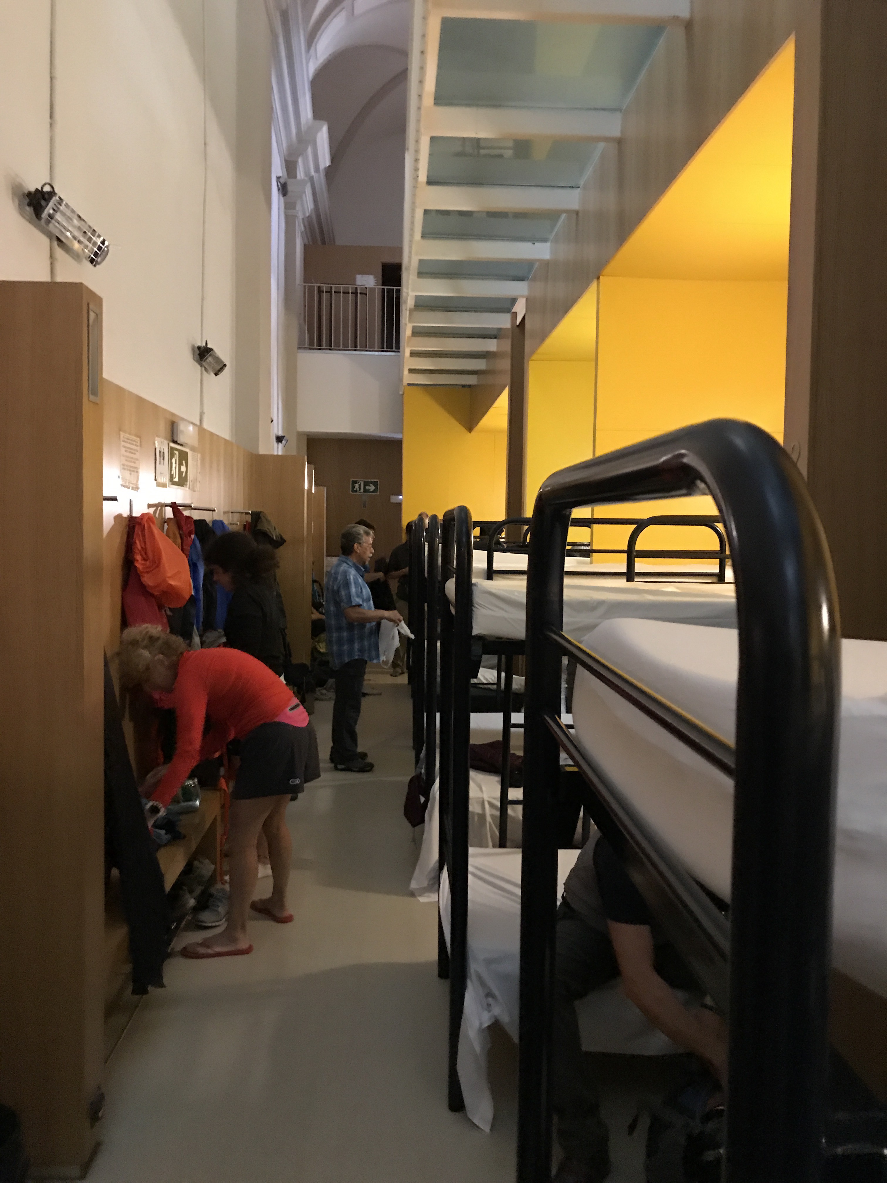 At 6 AM the albergue lights flash on like lightning. Suddenly, sleeping bags rustle as they are stuffed into sacs, zippers zip up and down, sandals shuffle along the wood floors, whispers and outright talking fill the air. These are the sounds of morning life in the albergue.