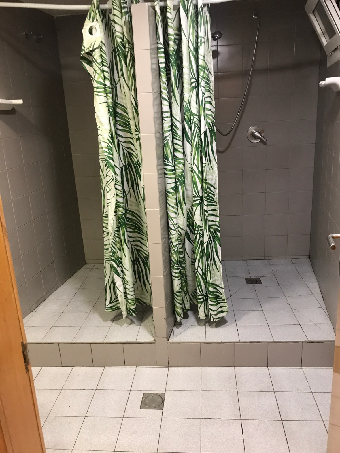 The coed flapping curtain shower room.
